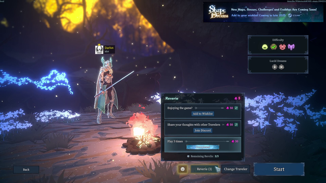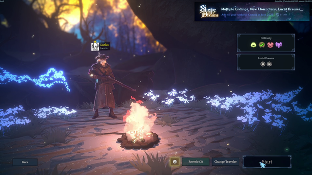 Ти обираєш одного з восьми Мандрівників — кожен має власний темп, набір здібностей і тінь за спиною. Гра не розповідає, ким вони були. І це працює: без минулого їм не болить. Вони просто йдуть уперед, виконуючи свій нескінченний цикл — як спогади, що не можуть згаснути.